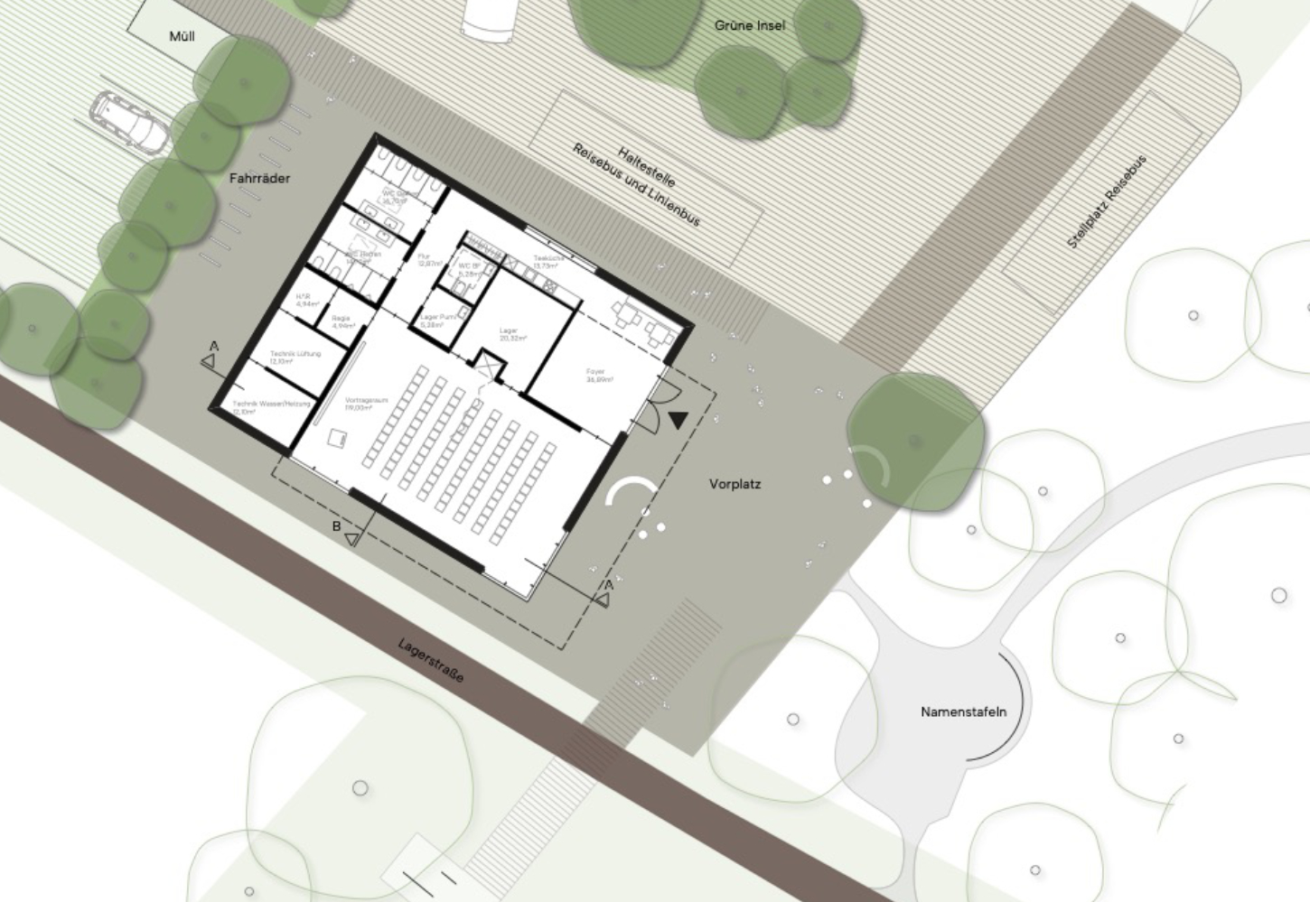 Der Baukörper wird am Schnittpunkt zwischen bisheriger Zufahrtsachse und historischer Lagerstraße platziert – am Schnittpunkt von Gegenwart und Vergangenheit. Damit bildet der Neubau einerseits einen weithin sichtbaren Anlaufpunkt für Besucher der Gedenkstätte und ermöglicht gleichzeitig wichtige Blickbeziehungen zum Haus der Gegenwart und zur ehemaligen Küchenbaracke des Lagers. Der Bereich für die PKW-Stellplätze wird außerhalb der Hauptsichtachsen westlich des Gebäudes in Richtung B200 angeordnet. Die historische Lagerstraße führt vom Vorplatz aus direkt in die Gedenkstätte. Das Haus der Gegenwart liegt in direkter Verlängerung der Sichtachse und bleibt als räumliche Ergänzung in seiner bisherigen Funktion voll erhalten.