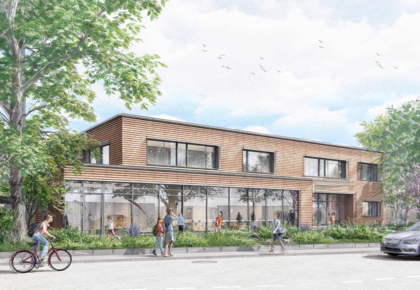 Der Neubau bildet das räumliche und funktionale Zentrum der Schule und öffnet sich mit dem Foyer und der Mensa gleichzeitig zur Öffentlichkeit. Das Gebäude wird als kompakter, weitestgehend zweigeschossiger Baukörper errichtet, und sorgt damit für positive Präsenz im Straßenraum und einen klar definierten Haupteingang zum gesamten Gebäudekomplex der Klaus-Groth-Schule. Der angrenzende eingeschossige Küchentrakt tritt zum Erhalt des wertvollen Baumbestandes gegenüber dem übrigen Gebäude deutlich zurück. Der Neubau ist so konzipiert, dass der gesamte zusätzliche Raumbedarf hier an einer Stelle untergebracht werden kann. Lediglich die Turnhalle erhält an der Südseite eine Erweiterung, so dass die Schulhoffläche dort vollständig als Spiel- und Bewegungsfläche erhalten bleibt.